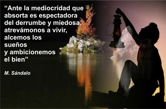 Alcemos los sueños y ambicionemos el bien Posted on febrero 15, 2009abril 30, 2020 by M.Angel Ante la mediocridad que, absorta, es espectadora del derrumbe y miedosa, atrevámonos a vivir, alcemos los sueños y ambicionemos el bien. (M. Sándalo) Entradas similares: El bien y la justicia El hombre de bien Desea hacer el bien El arte de hacer el bien