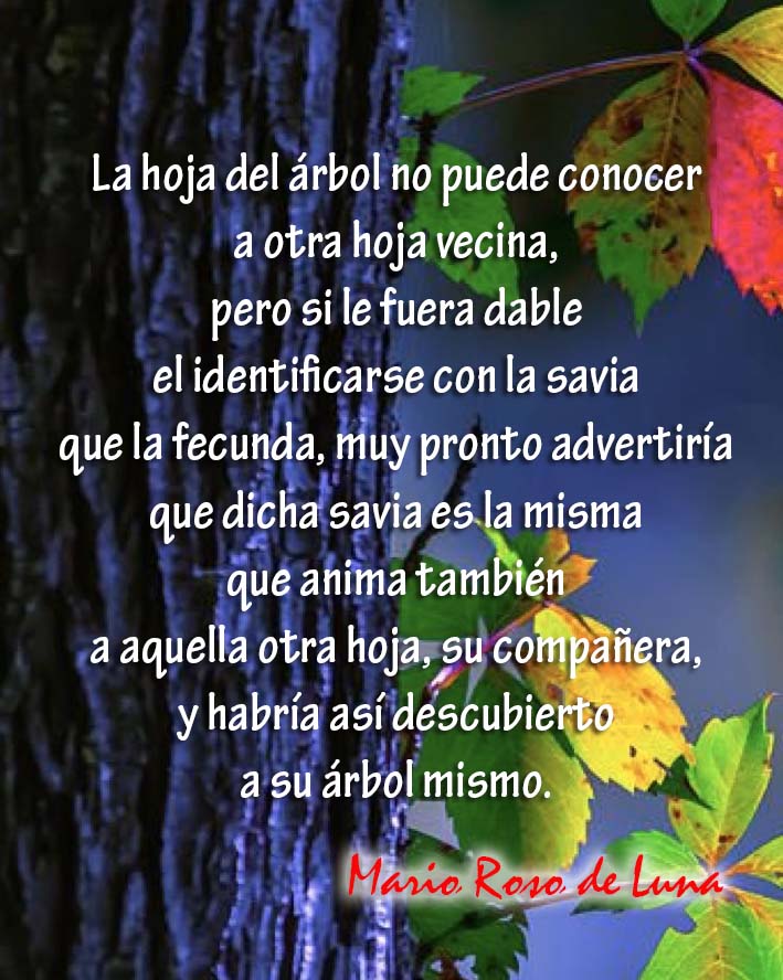 «La hoja del árbol no puede conocer a otra hoja vecina, pero si le fuera dable el identificarse con la savia que la fecunda, muy pronto advertiría que dicha savia es la misma que anima también a aquella otra hoja, su compañera, y habría así descubierto a su árbol mismo» (Mario Roso de Luna).